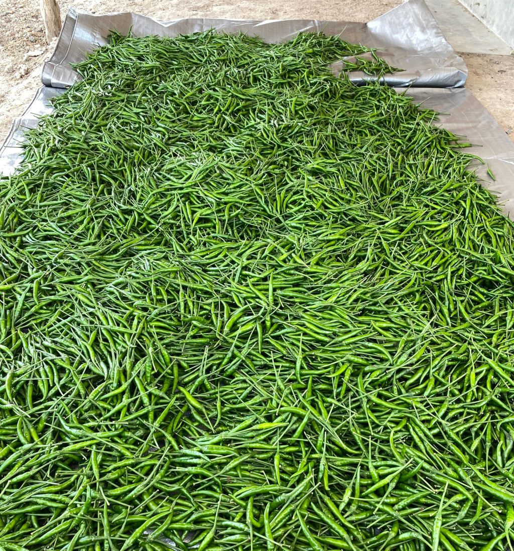 Fresh Green Chillies, harvesting 250 – 300kg per week. Green Red Demon, with stalks.